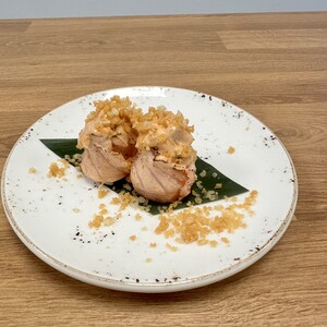2 pezzi : Salmone scottato esterno , tartare di salmone , salsa spicy , crunch